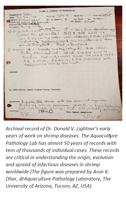 On May 05, 2021, Prof. Donald V. Lightner passed away in Tucson, Arizona, USA. On that day, the world of aquatic animal health lost a trailblazer and an icon. Throughout his career that spanned over 40 years, he played a seminal role in bringing shrimp aquaculture from utter obscurity and insignificance to a major global industry supporting the lives and livelihood of millions of people around the world, both directly and indirectly.
